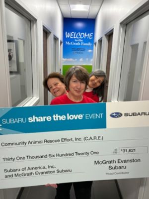 Many thanks to McGrath Evanston Subaru for sponsoring this year's 29th Annual Strut for Strays. We so appreciate McGrath's support. Last year, 2023, we found homes for 404 cats and dogs, a 3.5% increase over the previous year. The need for pet adoption in 2024 continues to grow, and we'll be close to 500 pet adoptions by the end of this year. C.A.R.E. relies solely on donations from individuals and corporations like Subaru, grants, and fundraising events like the Strut for Strays (our largest annual fundraising event) to support our mission of rescuing and rehoming animals in need and providing pet food from our pet food pantry at no cost to families that need help and want to keep their pets in their homes. Also, one of our dogs, Henry, who was at the Strut for Strays, has a meet and greet this week with a potential adopter who was at Strut for Strays. Fingers crossed!