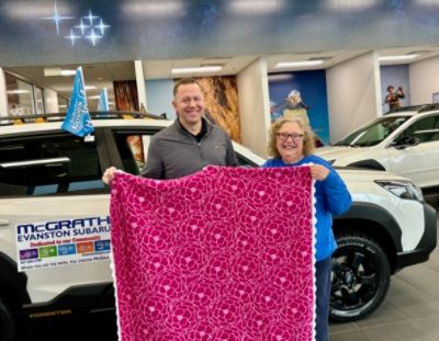 Fay Goldblatt meets Jeremy Gleason at McGrath Evanston Subaru to show off blankets made at the North Shore Senior Center to benefit cancer patients. McGrath Evanston Subaru helped the seniors connect with Endeavor Health so the Kellogg Cancer Center at Evanston Hospital could begin receiving the gift of warmth from Fay and her angles of warmth. When Fay started visiting the North Shore Senior Center (NSSC), she did not want to limit her activities to playing cards and sipping coffee with others. Then she learned about "Share the Warmth," and she's been here ever since now more than 15 years! Fay and her friend Carol lead a group every Wednesday and Friday to make blankets. Nearly 1,000 blankets are made yearly for people in need. Made from fleece and crocheted yarn, the blankets comfort chemotherapy patients at 20 different hospitals and trauma centers through the Linus Project.